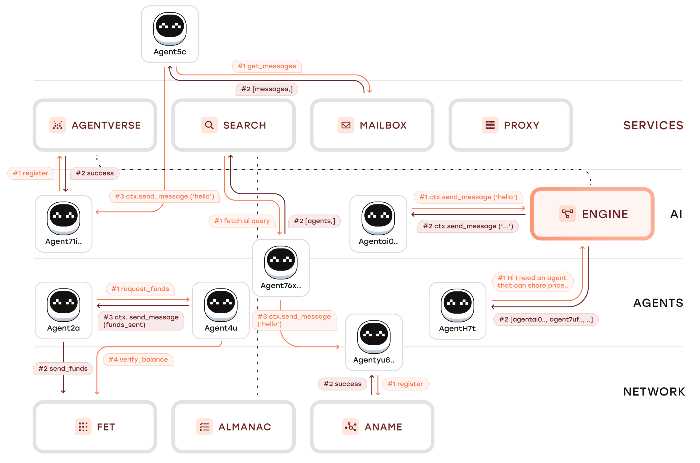Underneath this all is the Fetch.ai ledger, it's a blockchain that facilitates the FET token transactions, and decentralized smart contracts. It's essential for tiny payments that agents may make. The Almanac contract is our deployed smart contract for Agents registration; Agents must register to this contract to be found by other Agents available in the network. Agents transact FET tokens to purchase information or actions. You can read more about that here.